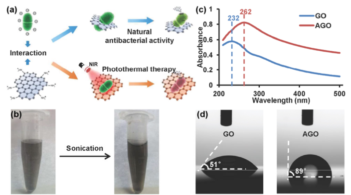 Figure 1. (a)原理圖。(b)新合成的AGO懸浮液的外觀。(c)GO和AGO的紫外光譜。(d)GO和AGO的接觸角測試。