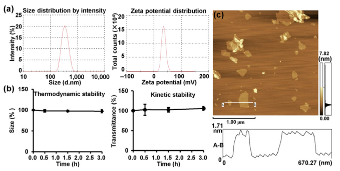 Figure 2. (a)AGO的典型尺寸分布(左圖)和zeta電位分布(右圖)。(b)AGO的熱力學(xué)穩(wěn)定性(左圖)和動(dòng)力學(xué)穩(wěn)定性(右圖)。(c)在相位成像模式下,由AFM檢查的AGO的形態(tài)(上圖)和紙張高度(下圖)。