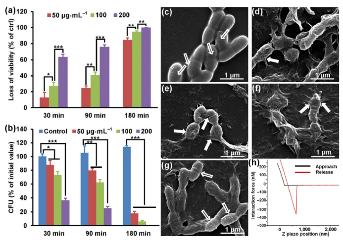 由于抗生素治療面臨耐藥性的巨大挑戰(zhàn),因此開發(fā)與抗生素?zé)o關(guān)的抗菌劑非常重要。氧化石墨烯(GO)由于其天然的抗菌機(jī)制(如鋒利的邊緣介導(dǎo)的切割效果)而成為有前途的試劑。然而,GO的抗菌活性受到其負(fù)電荷和低光熱效應(yīng)的限制。本文中,合成了具有獨(dú)特的三合一性質(zhì)的氨基官能化GO納米片(AGO)。AGO整合了三個(gè)基本特性(正電荷、強(qiáng)光熱效應(yīng)和自然切割效應(yīng))。正電荷(30 mV)使AGO與模型病原體變形鏈球菌(330 nN)有很強(qiáng)的相互作用力。孵育30分鐘后,自然切割效果為100μg·mL