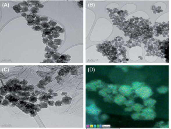 Figure 3. (A)SnFe,(B)SnFeP,(C)SnFeP@rGO的TEM圖像。(D)SnFeP@rGO的元素映射。