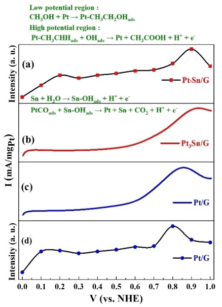 3Sn/G和(c)Pt/G電催化劑在CV測試的陽極掃描過程中,(a)Pt