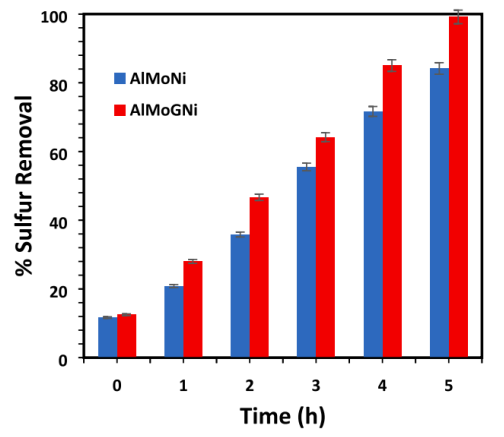 在加氫脫硫(HDS)過程中,除助催化劑外,二苯并噻吩(DBT)的活化還發(fā)生在催化劑的活性位點(diǎn)上。催化劑和促進(jìn)劑的分布都對HDS活性產(chǎn)生重大影響,并且隨著納米顆粒分布的改善,DBT分子將具有更多的活性位點(diǎn),可以被吸附和脫硫。在這項(xiàng)工作中,我們的想法是分別將Ni助催化劑負(fù)載在石墨烯上,將Mo催化劑負(fù)載在氧化鋁上,然后將獲得的Ni/石墨烯負(fù)載在Mo/氧化鋁上。對石墨烯上負(fù)載有Ni納米粒子的氧化鋁-鉬(AlMoGNi)的DBT的HDS進(jìn)行了評估。合成材料的表征是通過使用表面積分析儀、溫度程序分析、X射線粉末衍射分析儀、具有能量色散X射線光譜的掃描電子顯微鏡、透射電子顯微鏡、電感耦合等離子體和傅里葉進(jìn)行的變換紅外光譜。在反應(yīng)器中在573 K的溫度和53 bar的氫氣壓力下,研究了催化劑的催化效率。萘烷被用作具有百萬分之600的硫(ppm-S)的燃料。與不使用石墨烯的催化劑(約95 ppm-S,84%轉(zhuǎn)化率)相比,使用AlMoGNi催化劑可使測試燃料中的硫濃度降低(9 ppm-S,99%轉(zhuǎn)化率)。AlMoGNi催化劑的優(yōu)異性能可以通過其質(zhì)構(gòu)性質(zhì)、表面酸度和納米顆粒分散性來解釋。AlMoGNi催化劑上的加氫脫硫是通過氫解和加氫脫硫途徑進(jìn)行的。