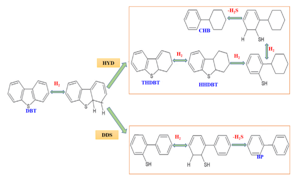 Figure 5. AlMoGNi催化劑上DBT反應(yīng)路徑的HDS