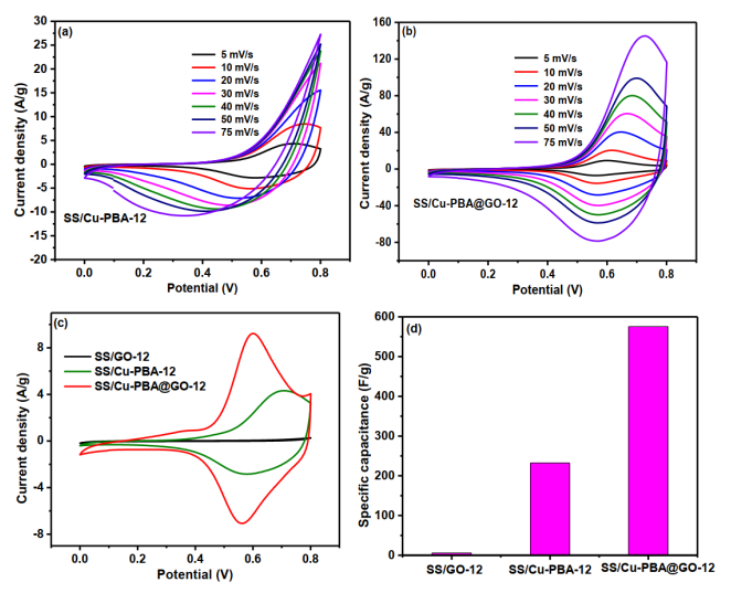 普魯士藍及其類似物作為金屬有機骨架之一,由于其出色的特性(例如高表面積、3D多孔網(wǎng)絡和低成本)而通常用于制造儲能電極。但是,它們具有較低的能量密度和電導率,這可能會限制其進一步的應用。在本文中,我們利用一種簡便且自下而上的新協(xié)議,將六氰合鐵酸銅納米立方體(Cu-PBA)沉積在氧化石墨烯(GO)的表面,作為超級電容器的無粘合劑電極。本文概述了簡便的連續(xù)離子層吸附和反應(SILAR)技術的優(yōu)點,及用于在便宜的不銹鋼基材上涂覆CuPBA@GO納米復合材料。研究了反應循環(huán)對Cu-PBA@GO納米復合材料的形貌、結晶度和電化學行為的影響,此外還研究了Cu-PBA與氧化石墨烯之間的有效協(xié)同作用。FTIR,XPS,SEM,TEM和XRD證實了在Cu-PBA/GO混合薄膜中形成的立方Cu-PBA。有趣的是,在電流密度為0.5 A/g的情況下,混合SS/Cu-PBA@GO-12可以提供611.6 F/g的卓越比電容,這是純Cu-PBA(225.93 F/g)的2.7倍;且具有更好的循環(huán)穩(wěn)定性,在4 A/g的電流密度下,經(jīng)過2000次循環(huán)后,它可以保留大約86%的初始電容。此外,混合電極在200 W/kg的比功率下可以達到54.37 Wh/kg的最高能量密度值。Cu-PBA@GO雜化物的這種出色電化學行為可通過使用綠色且經(jīng)濟高效的方法代替有機基超級電容器,為智能和柔性超級電容器的開發(fā)開辟道路。