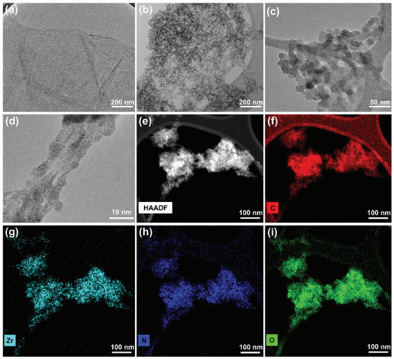 2的(e)HAADF圖,(f)碳、(g)Zr、(h)N和(i)O的元素曼譜圖