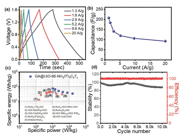 -1,大大高于傳統(tǒng)的基于石墨烯的材料。結(jié)果表明,酰胺鍵在π共軛結(jié)構(gòu)的形成中起關(guān)鍵作用,它有助于電荷轉(zhuǎn)移,因此具有良好的電容和循環(huán)穩(wěn)定性。此外,為了實(shí)現(xiàn)實(shí)際可行性,已經(jīng)構(gòu)造了使用GA@UiO-66-NH