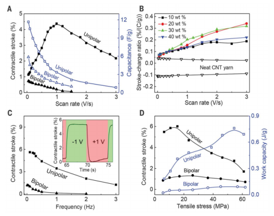 在此,本文描述了單極沖程碳納米管紗線肌肉,其中肌肉沖程在極端電位之間的變化是累加的,隨著電位掃描速率的增加,肌肉沖程大幅增加。隨著掃描速率的增加,有效離子尺寸的顯著增加超過(guò)了正常沖程減少。單極肌肉實(shí)現(xiàn)了增強(qiáng)的肌肉沖程、每周期收縮功、收縮功率密度和能量轉(zhuǎn)換效率。