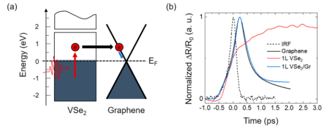 Figure 3. 1L VSe2/Gr界面處的層間熱電子轉(zhuǎn)移。(a)從VSe2到Gr的層間熱電子轉(zhuǎn)移的示意圖。(b)Gr,1L VSe2和1L VSe2/Gr的時(shí)間分辨的TR結(jié)果。