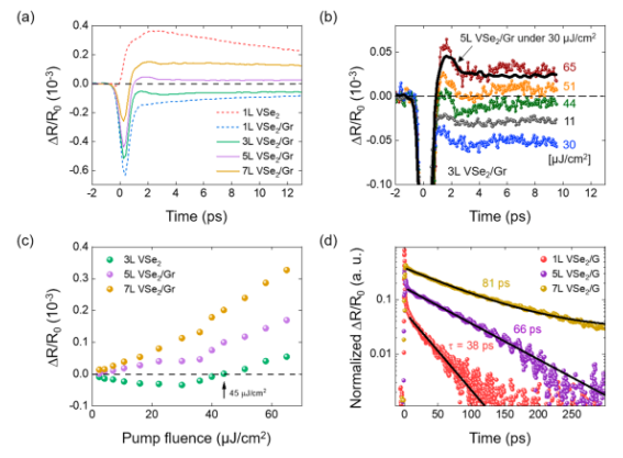 Figure 4.(a)3L,5L和7L VSe2/Gr的時(shí)間分辨TR測(cè)量。(b)3L VSe2/Gr在各種泵注量下的TR信號(hào)。(c)從每個(gè)樣品獲得的泵浦流量相關(guān)的TR信號(hào)。(d)MtL VSe2/Gr中的衰減特性。