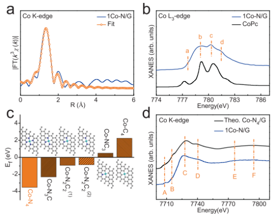 Figure 2. Co原子周圍的配位構(gòu)型。a)在R空間中的Co K邊緣EXAFS擬合曲線。b)Co L3-edge XANES光譜。c)DFT計(jì)算了石墨烯晶格中各種Co-N4-xCx部分的形成能。d)實(shí)驗(yàn)性Co-edge XANES光譜比較。