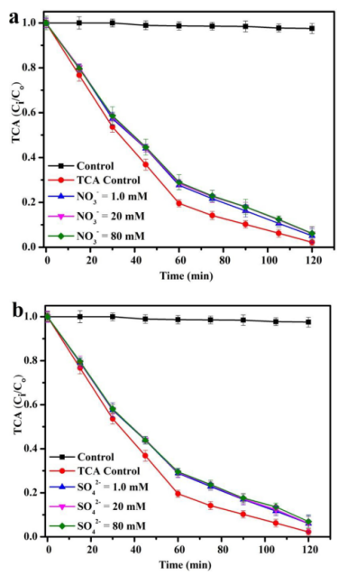 Figure 3. 溶液基質(zhì)對TCA降解的影響:a)HCO