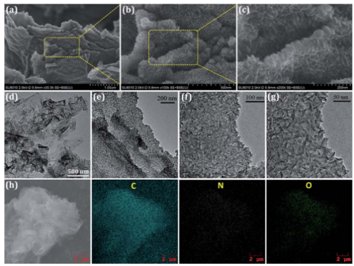Figure 2.PI@GS-2的(a–c)SEM和(d–g)TEM圖像,(h)其C,N和O的元素映射。