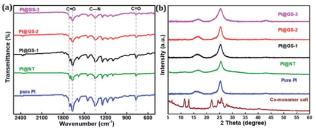 Figure 4(a)純PI,PI@GS和PI@NT復合材料的FT-IR光譜。(b)共聚單體鹽,純PI以及PI@GS和PI@NT復合材料的XRD圖譜。