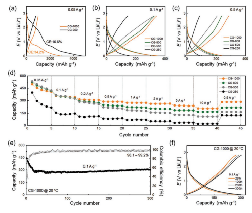 -1時CG-250、CG-500、CG-800和CG-1000的GCD曲線。d)CG-250、CG-500、CG-800和CG-1000的速率相關容量。e)相對于沒有電位保持的Li/Li