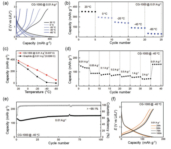 –1下石墨和CG-1000負極的溫度相關容量。d)CG-1000在−40°C時的倍率性能。e)CG-1000在−40°C下的循環(huán)穩(wěn)定性。f)CG-1000的相應GCD曲線。