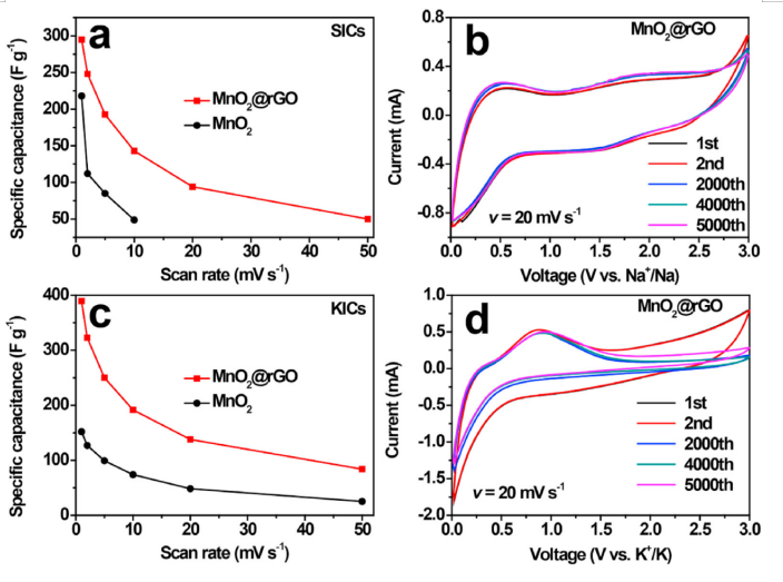 2@rGO納米線可以用作K離子電容器(KICs)和Na離子電容器(SICs)的負極。考慮到它們易于合成、環(huán)境友好和成本低廉,MnO