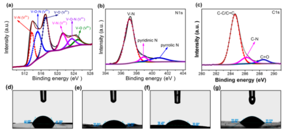 圖2. VN@N-rGO多功能層的表征和接觸角。VN@N-rGO多功能層的(a)V2p,(b)N1s和(c)C1s光譜。(d)原始PP、(e)VN/PP分離器、(f)N-rGO/PP和(g)VN@N-rGO/PP的接觸角,使用靜態(tài)電解質(zhì)液滴分離器。