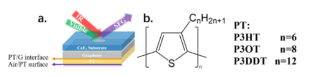 石墨烯和半導(dǎo)體聚合物已被廣泛研究用于許多微電子設(shè)備中。對(duì)于具有層狀結(jié)構(gòu)和石墨烯半導(dǎo)體聚合物復(fù)合材料的設(shè)備,石墨烯和半導(dǎo)體聚合物之間的分子相互作用在確定界面性質(zhì)和影響設(shè)備性能方面都起著重要作用。本研究利用和頻發(fā)生(SFG)振動(dòng)光譜法測(cè)定了三種不同側(cè)鏈長(zhǎng)度的聚噻吩(PTs)在PT/石墨烯界面上的分子取向。發(fā)現(xiàn)PT側(cè)鏈越長(zhǎng),測(cè)得的PT主鏈傾斜角越大。因此,具有較長(zhǎng)側(cè)鏈長(zhǎng)度的PT主鏈在石墨烯上采用了更平躺的姿勢(shì)。不同側(cè)鏈長(zhǎng)度的PTs在PT/CaF