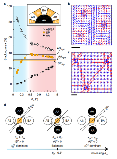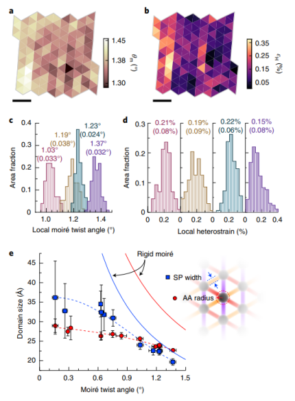 范德華異質外延技術能夠準確控制原子層之間的晶格失配或方位取向,以產生長波長超晶格。產生的電子相主要取決于超晶格的周期性和引入無序和應變的局部結構變形。在這項研究中,作者使用了布拉格干涉儀來捕獲扭曲角小于2°的扭曲雙層石墨烯中的原子位移場。對扭轉角和單軸異應變的納米級空間波動進行了統(tǒng)計評估,揭示了摩爾異質結構中短程無序的普遍性。通過定量映射應變張量場,揭示了結構弛豫的兩種機制,并解開了組成旋轉模式的電子貢獻。此外,作者發(fā)現所應用的異應變各向異性地聚集在鞍點區(qū)域,從而產生獨特的條紋應變相。該研究結果建立了扭曲雙分子層石墨烯與扭曲角的電子行重建機理的關系,并為直接觀察云紋材料中的結構弛豫,無序和應變提供了框架。