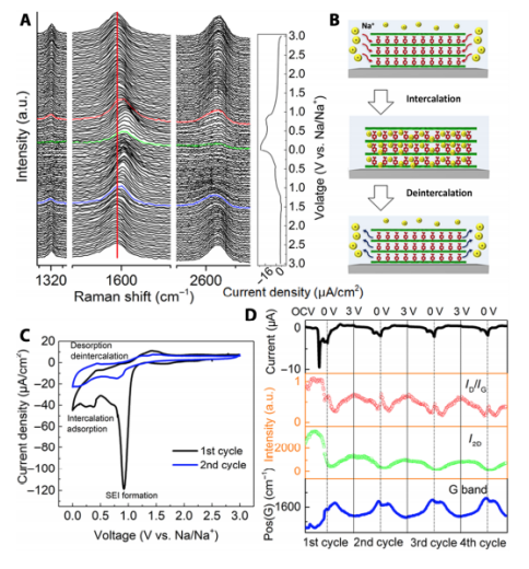 +可以可逆插入,還可以通過(guò)操作拉曼光譜電化學(xué)和成像橢偏儀進(jìn)行監(jiān)測(cè)。該Janus石墨烯具有均勻的孔徑、可控的功能化密度和較少的邊緣,其儲(chǔ)存Na