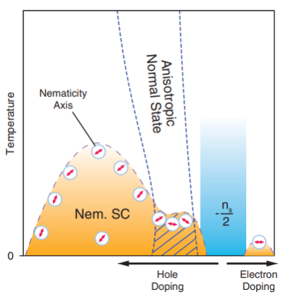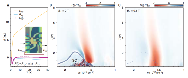 在固態(tài)系統(tǒng)中,強(qiáng)相互作用電子通常在基態(tài)中顯示出多個(gè)破壞的對(duì)稱性。不同階參數(shù)之間的相互作用可以產(chǎn)生豐富的相圖。報(bào)道了在魔角扭曲雙層石墨烯(TBG)中識(shí)別具有破碎旋轉(zhuǎn)對(duì)稱性的纏繞相。利用橫向電阻測(cè)量,發(fā)現(xiàn)一個(gè)強(qiáng)各向異性相,位于超導(dǎo)圓頂?shù)那窊诫s區(qū)域上方的“楔形區(qū)”內(nèi)。當(dāng)它與超導(dǎo)圓頂交叉時(shí),觀察到臨界溫度的降低。此外,超導(dǎo)態(tài)表現(xiàn)出對(duì)與方向相關(guān)的面內(nèi)磁場(chǎng)的各向異性響應(yīng),揭示了整個(gè)超導(dǎo)圓頂?shù)南蛄杏行?。這些結(jié)果表明,向列波動(dòng)可能在魔角TBG的低溫相發(fā)揮重要作用。