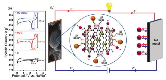 Figure 4.a(chǎn)) N-C、N-MCS和N-MCS@GO在0.5 mV s-1下于NAE-0.05電解液中的循環(huán)伏安圖。b) SMBs體系中附加的I3 - /I -氧化還原對電化學原理圖。