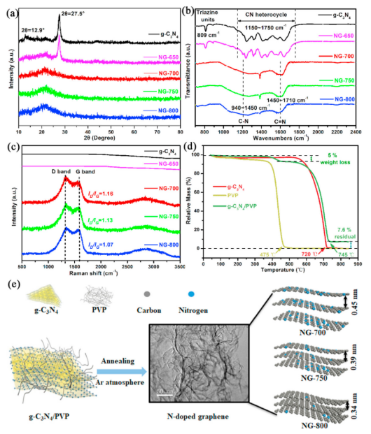 Figure 1. g-C3N4 前驅(qū)體和不同溫度下g-C3N4-衍生的N摻雜石墨烯的 (a) XRD圖譜、(b) FTIR 光譜和 (c) 拉曼光譜。(d) g-C3N4、PVP和g-C3N4/PVP的TG曲線;(e) 在PVP的輔助下,N摻雜石墨烯轉(zhuǎn)化的示意圖。