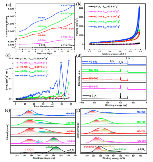 2吸附-解吸等溫線;(c) 孔隙尺寸分布曲線;(d) XPS 全譜;(e) 高分辨率 C 1s;(f) g-C3N4前驅(qū)體和不同溫度下g-C3N4-衍生的N摻雜石墨烯的高分辨率N 1s光譜。