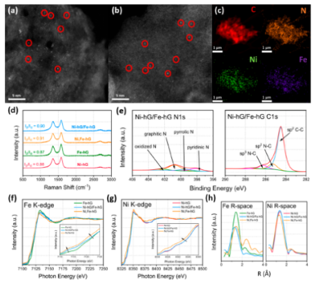 Figure 2. 物理化學特性。(a-b)樣品的HAADF-STEM圖像。(c) EDX元素分布。(d)拉曼測量。(e)高分辨率N 1s和C 1s光譜。每種催化劑在(f) Fe K-edge和 (g) Ni K-edge的x射線吸收近邊精細結(jié)構(gòu)(XANES)光譜和放大曲線,以及在Fe和Ni的R空間。