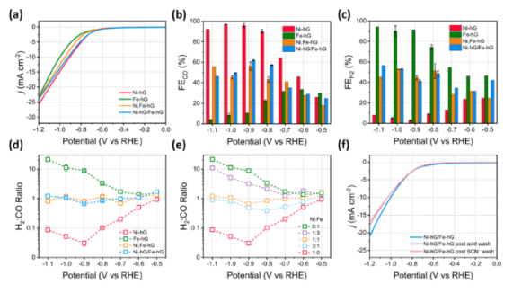 在該研究中,提出了一種自上而下的方法,用于在多孔石墨烯框架內(nèi)控制制備欠配位的Ni-Nx(Ni-hG)和Fe-Nx(Fe-hG)催化劑,用于電化學還原CO2 (CO2RR)s生成合成氣。通過對商用級含氮石墨烯進行熱處理,制備出一種有缺陷的多孔石墨烯,然后將其用作支撐,通過碳缺陷修復來引入欠配位的單個原子。研究發(fā)現(xiàn),這些Ni-hG和Fe-hG催化劑可以以任何比例混合,從而在0.6~1.1 V電壓范圍內(nèi)產(chǎn)生了所需的合成氣比(1:10),這是液體燃料和化學品費托合成的商業(yè)要求。這些發(fā)現(xiàn)與密度泛函理論計算相一致,理論計算表明,隨著氮與鎳配位的減少,CO的選擇性增加,而不飽和鐵則有利于析氫反應。在高通量氣體擴散電解槽中,這些催化劑在高溫下的選擇性和穩(wěn)定性保持不變,在槽電壓為2.5V時,顯示出275 mA mg−1的高質(zhì)量標準化活性,這進一步證明了該催化劑的巨大的應用潛力。該實驗結(jié)果為實施簡單的自上而下方法制造欠配位單原子催化劑,用于脫碳合成氣的生產(chǎn)提供了有價值的見解。