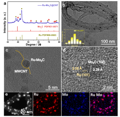 Figure 1. Ru-Mo2C@CNT催化劑的物理表征。包括Ru-Mo2C@CNT的XRD圖譜,透射電鏡圖(插圖是納米顆粒的尺寸分布),Ru-Mo2C@CNT的HRTEM圖像,HAADF-STEM圖像以及相應(yīng)的EDX元素分布。