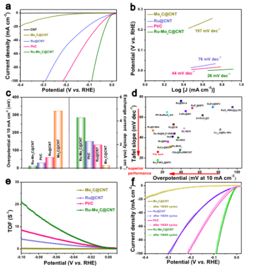 探索一種簡(jiǎn)單、快速、無(wú)溶劑的合成方法,來(lái)大規(guī)模制備用于工業(yè)析氫反應(yīng)的廉價(jià)、高活性電催化劑,是當(dāng)今最有前途的工作之一。本工作采用一種簡(jiǎn)單、快速、無(wú)溶劑的微波熱解方法,一步合成了具有非均相結(jié)構(gòu)和強(qiáng)金屬-載體相互作用的超小型(3.5 nm) Ru-Mo2C@CNT催化劑。Ru-Mo2C@CNT催化劑在10mA·cm-2的電流密度下僅需要15mV的過(guò)電位,并且在1.0 M KOH中100mV過(guò)電位下表現(xiàn)出高達(dá)21.9 s-1的周轉(zhuǎn)頻率。此外,該催化劑在56 mV和78 mV的低過(guò)電位下可達(dá)到500mA·cm-2和1000mA·cm-2的高電流密度,并表現(xiàn)出1000 h的高穩(wěn)定性,為其他大規(guī)模生產(chǎn)催化劑的合理設(shè)計(jì)提供了可行的途徑。