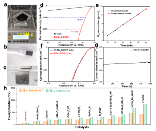 Figure 4.大規(guī)模生產(chǎn)Ru-Mo2C@CNT催化劑用于HER的試驗(yàn)。a-c.催化劑的照片,直接滴涂在納米纖維上的Ru-Mo2C@CNT催化劑的照片,H2氣泡離開(kāi)Ru-Mo2C@CNT表面的照片。d.在1.0 M KOH溶液中的極化曲線。e.1.0 M KOH制氫的理論和實(shí)驗(yàn)結(jié)果。f.10,000次循環(huán)前后的極化曲線對(duì)比。g .在1000小時(shí)內(nèi)保持500 mA cm-2所需電勢(shì)的時(shí)間演變情況,電流-時(shí)間(I–t)曲線。h.與文獻(xiàn)的性能相比較。