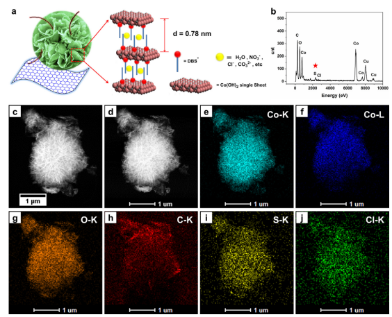2-GC的 (b) EDS光譜,(c) STEM圖像和 (d-j) Co-K、Co-L、O-K、C-K、S-K和Cl-K的元素映射圖像。