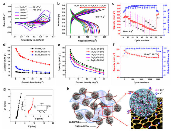 Figure 4. 電池型Co3O4-GC多級微球三元復(fù)合材料的電化學性能:(a)CV曲線,(b)GCD曲線,(c)倍率性能,(d)Co(OH)2-GC和Co3O4-GC復(fù)合材料的倍率性能。(e) Co3O4-GC復(fù)合材料在250 °C下燒結(jié)時的倍率性能。(f)循環(huán)性能。 (g) Co3O4-GC 的Nyquist 圖和等效電路(插圖)。(h) Co3O4-GC三元復(fù)合材料在KOH溶液中的充放電過程示意圖。