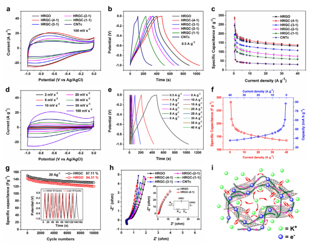 Figure 5. HRGO、CNTc和HRGC(不同的HRGO/CNTc質(zhì)量比為4:1、3:1、2:1、1:1)氣凝膠的電化學性能:(a)CV曲線,(b)GCD曲線,(c)不同電流密度下的平均比電容(至少四個電極材料樣品)。HRGC的電化學性質(zhì)(HRGO/CNTc的質(zhì)量比為4:1):(d)CV曲線,(e)GCD曲線,(f)比電容,(g)循環(huán)性能,最初10次和最后10次循環(huán)的GCD曲線(插圖)。(h) HRGO、CNTc和HRGC(HRGO/CNTc的不同質(zhì)量比為4:1、3:1、2:1、1:1)氣凝膠的Nyquist圖和等效電路。(i) 3D HRGC氣凝膠的充放電過程示意圖。