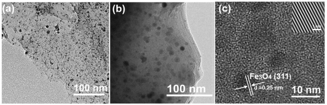 Figure 2. (a) MGO 和 (b) MGO-TA/Fe3+的TEM圖像,以及 (c) MGO-TA/Fe3+納米復(fù)合材料的HRTEM圖像。