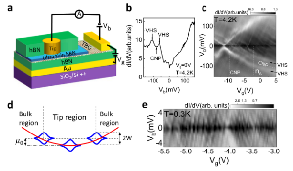 Figure 4.TBG平面隧道器件中的載流子限制。a)平面隧道器件示意圖,b)在0 V背柵電壓下測量的隧道光譜,c)STS柵電壓相關(guān)的漫譜,d)電荷中性點位置相關(guān)性示意圖,e) 柵電壓相關(guān)的高分辨