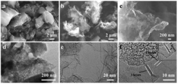 Figure 3.G/AC 的SEM和TEM分析。(a-c)SEM圖像;(d-f)TEM圖以及HRTEM圖。