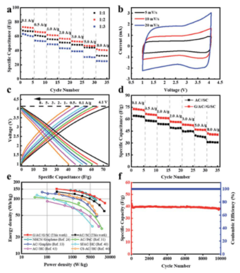 Figure 4.G/AC//G/SC LICs的電化學(xué)性能。(a)具有不同陽極和陰極質(zhì)量比的G/AC//G/SC LICs的倍率性能比較;(b)G/AC//G/SC LICs在不同掃描速率下的CV曲線;(c)不同電流密度下的放電曲線;(d)倍率性能比較;(e)能量密度和功率密度相關(guān)的曲線;(f)G/AC//G/SC LICs的循環(huán)性能。