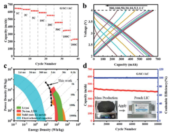Figure 5. AC//G/SC LIC的電化學(xué)性能。(a)在1–200 C的2–4 V電壓范圍內(nèi),AC//G/SC LIC的放電容量;(b)在1–200 C下LIC軟包電池的充電和放電曲線;(d) LIC軟包電池在50 C下的循環(huán)性能。