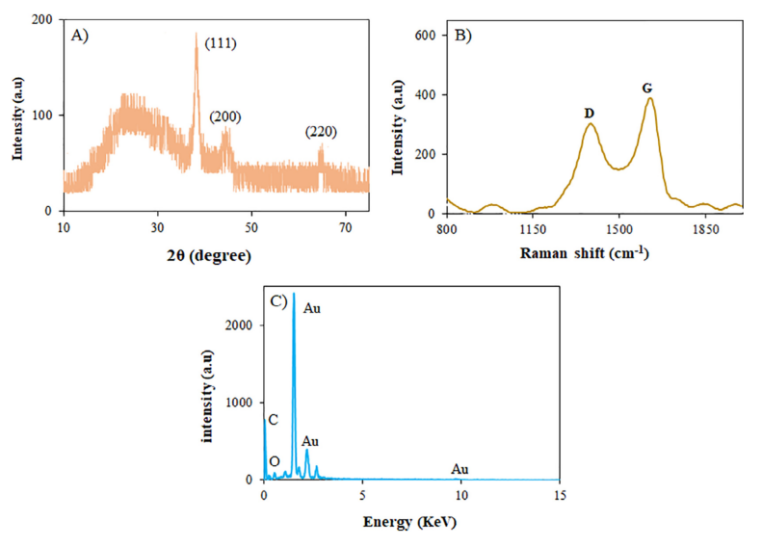 圖2. AuNS@GQDs 和GQDs的XRD圖譜(A),拉曼光譜(B)和EDS譜圖(C)。