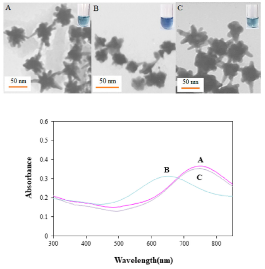 圖1. 使用200μL (A) 和450μL (B)的種子液合成的AuNS@GQDs的TEM圖,以及他們對應(yīng)的紫外-可見光吸收光譜。