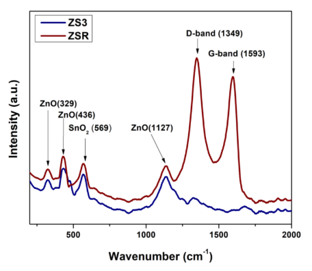 2 納米復(fù)合物 (ZS1, ZS2, ZS3,ZS4), (b) rGO 修飾的 ZnO-SnO