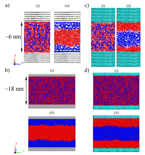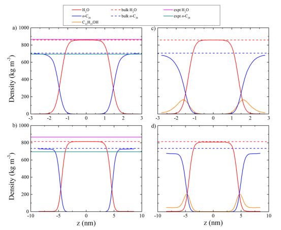 Figure 2. 使用 (a) AA 和 (b) CG 描述的bulk n-C28-H2O 混合物的質(zhì)量密度分布。使用 (c) AA 和 (d) CG 模擬添加十二醇的bulk n-C28-H2O 混合物的部分密度分布。
