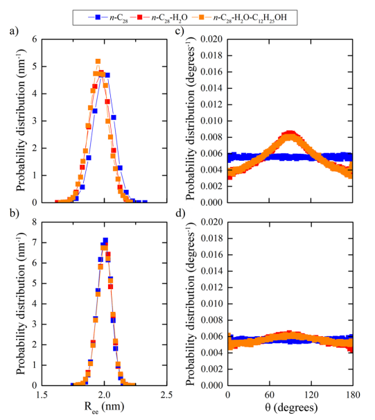 Figure 3. 在473 K和3.4 MPa下,純bulk n-C28、n-C28-H2O和nC28-H2O-C12H25OH體相混合物中,(a,b) Ree的AA和CG n-C28概率分布,以及(c,d)端到端和z軸矢量之間形成的傾斜角θ