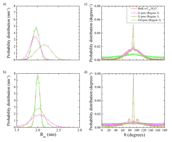 Figure 4. G和GO孔中,(a和b) Ree的AA和CG n-C28概率分布,以及(c和d)端到端和孔表面法向量之間形成的傾斜角θ。bulk n-C28-H2O混合物的結(jié)果以供比較。
