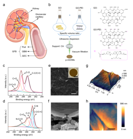 Figure 1. 氧化石墨烯薄膜的制備。(a)腎臟中腎小球發(fā)生過(guò)濾功能,(b)氧化石墨烯薄膜制備過(guò)程示意圖,(c-d)XPS光譜,(e-f)頂視及橫截面SEM圖,(g-h)5p-nGOM的AFM圖。