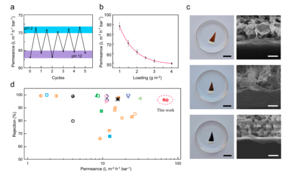 Figure 4.氧化石墨烯薄膜的應(yīng)用性能。(a)5p-nGOM的循環(huán)滲透門(mén)控性能,(b)5p-nGOM的透水性與單位面積載量的函數(shù)關(guān)系,(c) 5p-nGOM膜的穩(wěn)定性測(cè)試,在水溶液中浸泡30天,(d)透水性和分子分離性能。