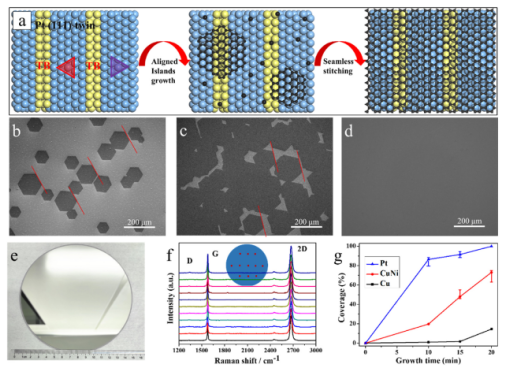 Figure 1. 在鉑襯底上生長6英寸單晶石墨烯。(a)生長單晶石墨烯的示意圖。(b-d)石墨烯分別在鉑薄膜上生長5、10和20分鐘的掃描電鏡圖像。(e)Pt/Al2O3上生長6英寸單晶石墨烯的照片。(f)拉曼光譜。(g)石墨烯在Pt、CuNi和Cu薄膜上的覆蓋率。